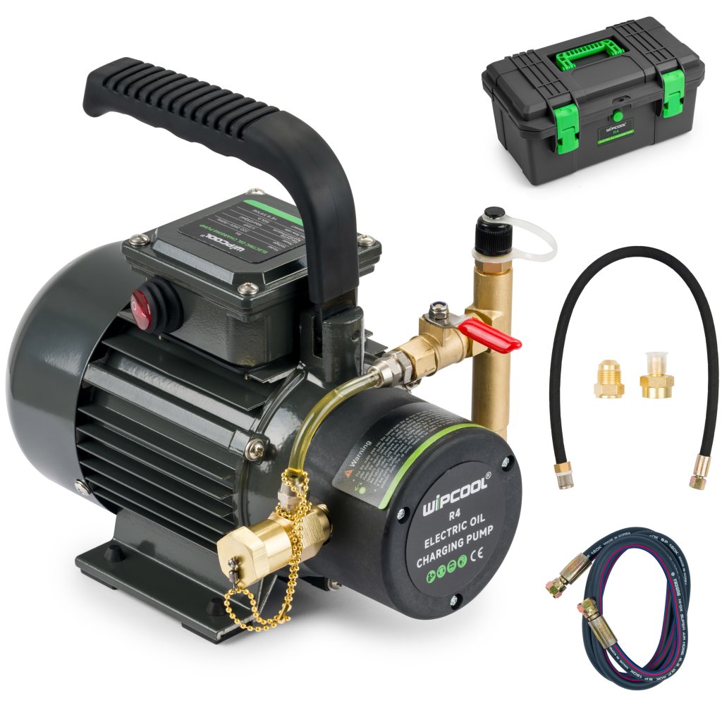 Przenośna elektryczna pompa do transferu oleju R4, idealna do ładowania oleju do dużych systemów HVAC. Dzięki silnikowi elektrycznemu o mocy 1/3 HP, bezpośrednio połączonemu z precyzyjną pompą zębatkową o stałym przemieszczeniu, olej można pompować do systemu w trakcie jego pracy.